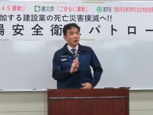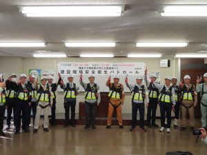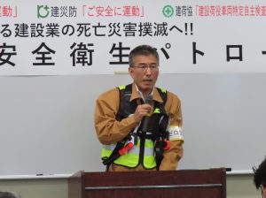 続いて小川 裕由 労働基準部長が「年末に向けて工事が増える時期に差し掛かるが、安全管理を徹底し、現場で災害が発生しないよう効果あるパトロールの実施をお願いしたい」と挨拶されました。その後、大河原 康志 参与会副委員長から「死亡災害絶対撲滅 命綱GO活動で墜落・転落災害防止 がんばろう!命綱GOよし!」の掛け声により安全唱和が行われ、各班に分かれて現場のパトロールを実施しました。