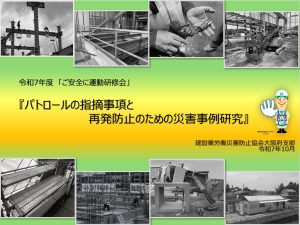 今年の研修会テーマは「パトロールの指摘事項と再発防止のための災害事例研究」です。テキストでは、昨年好評であった実際の災害事例と関連するパトロールでの指摘事例を引き続き取り上げました。今年は新たな着眼点として、過去5年間の建設労働災害データから発生割合の高い災害の型に着目し、同様の災害の未然防止を最大の目的として掲げ、実際の現場パトロールでの指摘事例(臨検事例含む)、実際の災害事例(事故事例含む)を型別に掲載しました。指摘事例においては、指摘に至った経緯やアドバイスと根拠となる適用法令等につき、できるだけ丁寧に記載し、巻末には参与会各社から収集した良好事例も掲載しております。